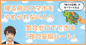 頭では分かってるんだけど、夜寝る前とか、気づかないうちにゴロゴロしながらスマホを持ち込んじゃうんだよね……。
